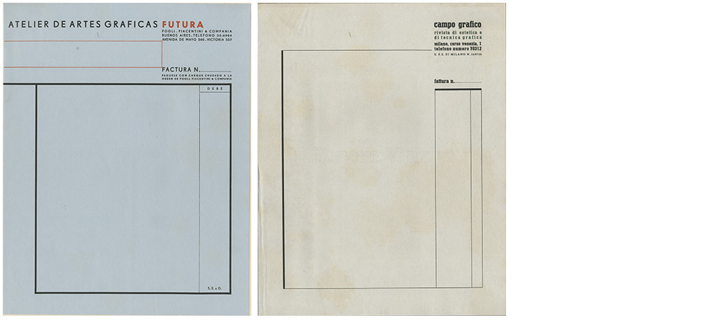 Fatture commerciali: Attilio Rossi, Atelier de Artes Graficas Futura, Buenos Aires (febbraio 1936); Enrico Bona, “Campo Grafico” (luglio-agosto-settembre 1938)